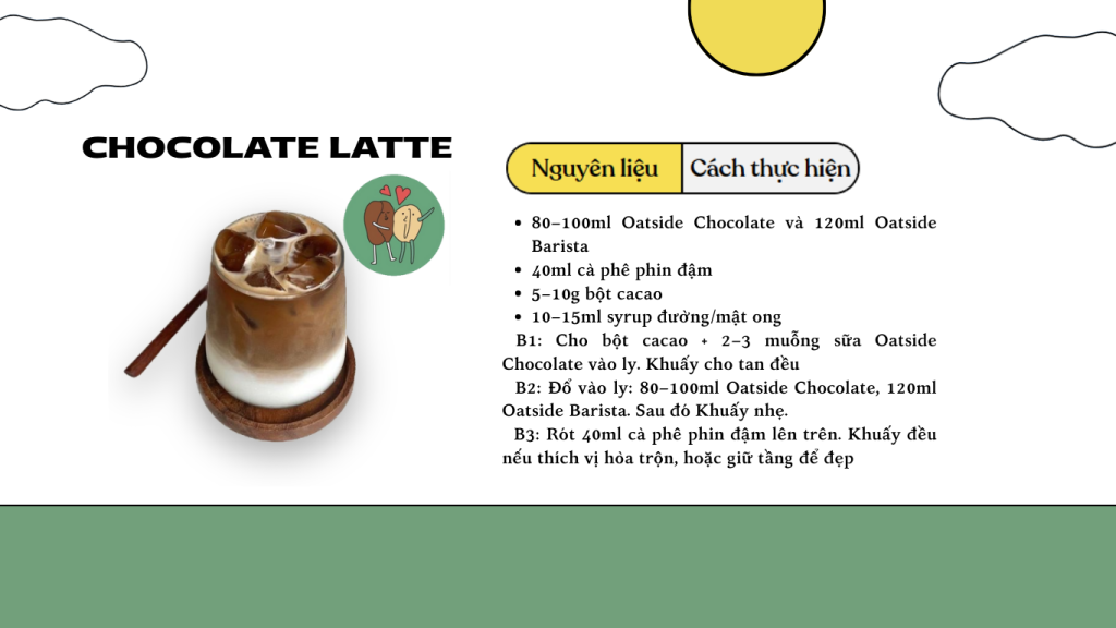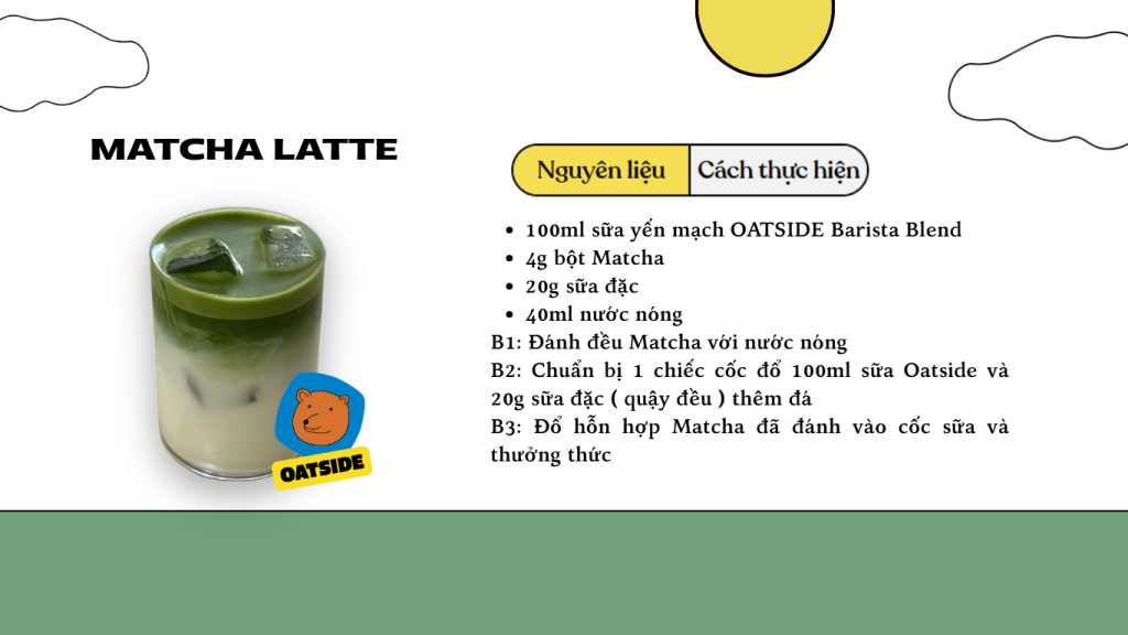 Nếu bạn đang tìm những món vừa dễ làm – healthy – thơm béo từ sữa hạt Oatside, thì ba công thức dưới đây chính là lựa chọn hoàn hảo để thưởng thức mỗi ngày. Từ Matcha Latte Trà Xanh thanh mát, Chocolate Latte đậm đà đến Berry Smoothie mát lạnh bổ dưỡng, tất cả đều sử dụng Oatside Barista và Chocolate để mang lại hương vị mượt mà, tự nhiên và hoàn toàn không dùng sữa bò.